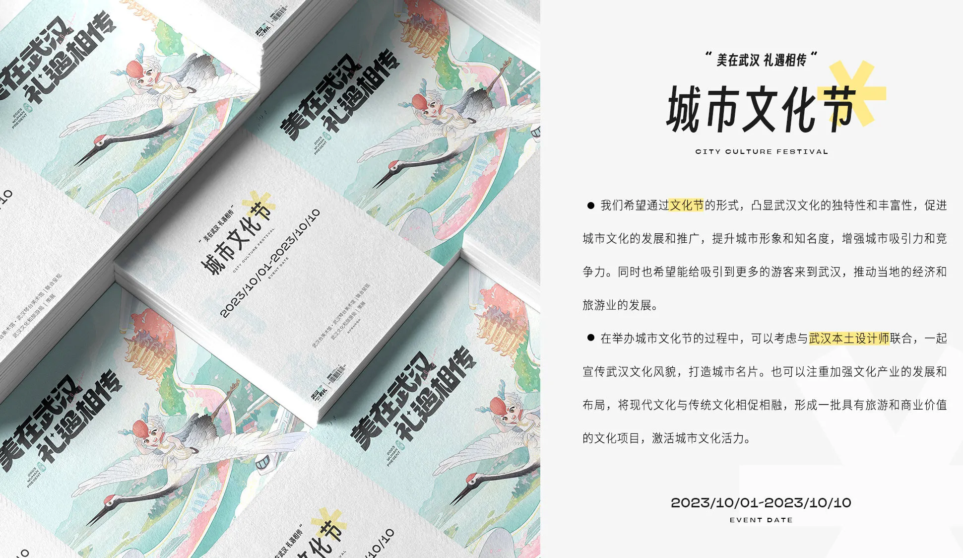 本次視覺方案以【武漢有禮更有你、千翎QianLing、城市文化節】為主要板塊,傳遞正能量,展現武漢市民的熱情友善和包容精神,打造以“武漢有禮”為主題的形象,并將其推廣給更廣泛的受眾群體。以文化節和地標打卡形式充分展示武漢文化的特色和豐富性,促進城市文化發展與推廣。以武漢歷史文化的傳播與解讀,增強居民對城市的歸屬感與自豪感,提升城市形象和知名度,推動文化經濟發展。