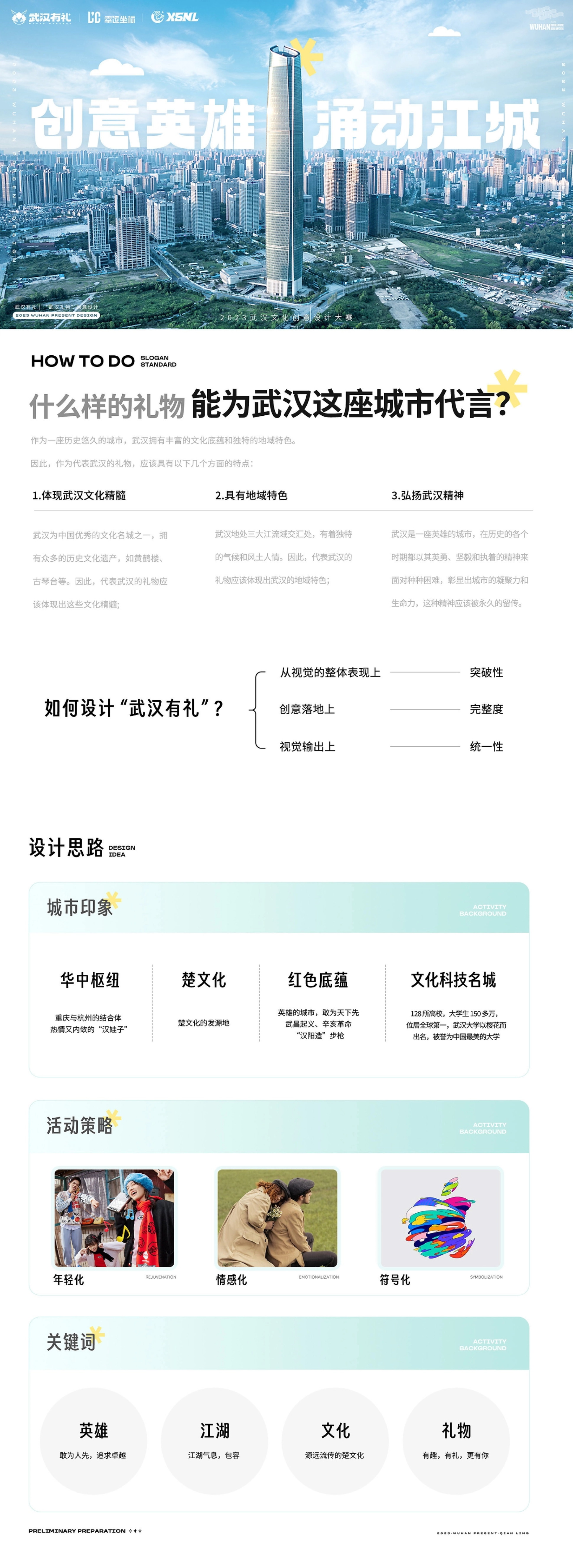 本次視覺方案以【武漢有禮更有你、千翎QianLing、城市文化節】為主要板塊,傳遞正能量,展現武漢市民的熱情友善和包容精神,打造以“武漢有禮”為主題的形象,并將其推廣給更廣泛的受眾群體。以文化節和地標打卡形式充分展示武漢文化的特色和豐富性,促進城市文化發展與推廣。以武漢歷史文化的傳播與解讀,增強居民對城市的歸屬感與自豪感,提升城市形象和知名度,推動文化經濟發展。